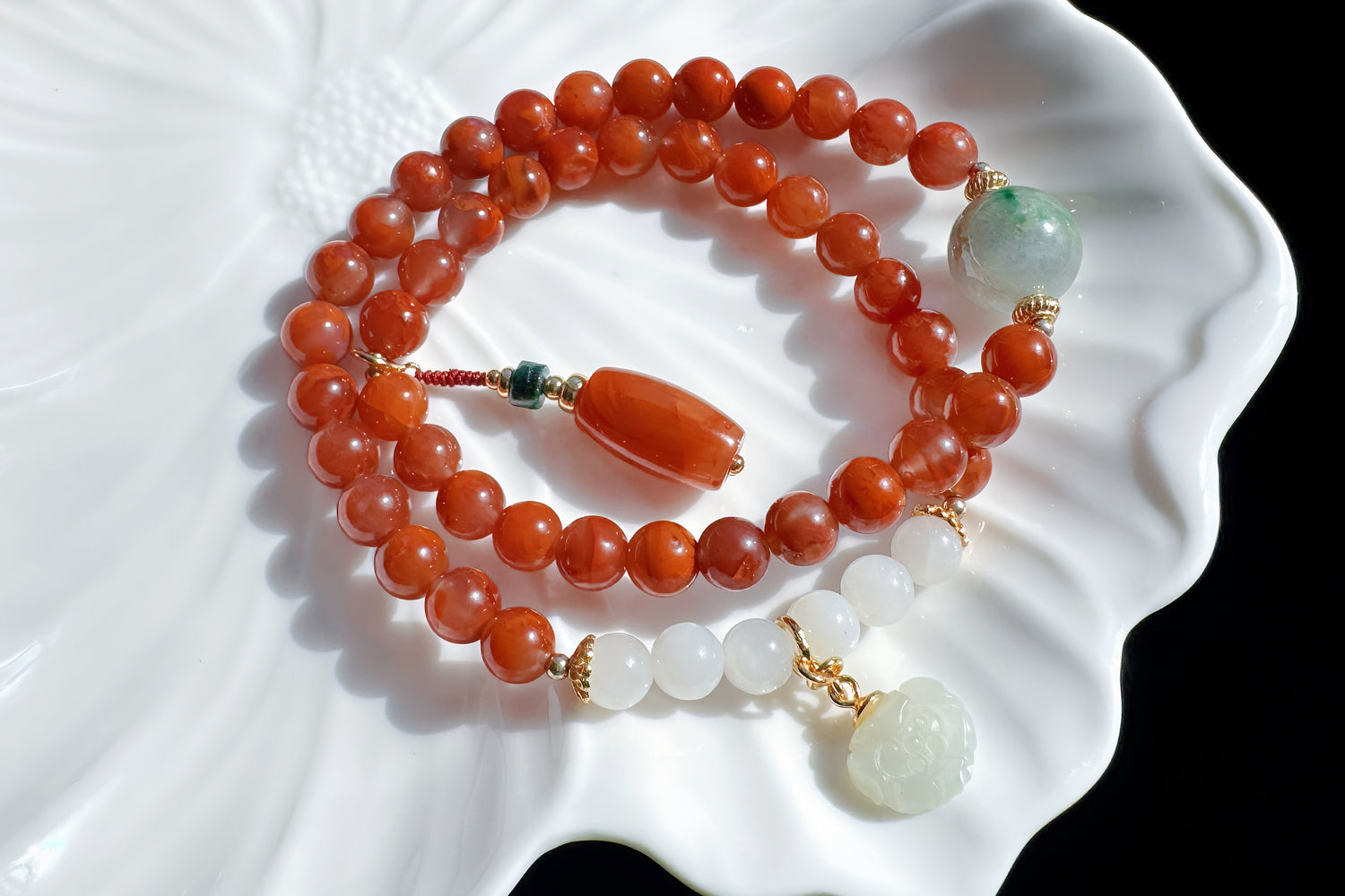 11.5mm Natural Light Gray Hetian Nephrite Jade Bracelet with Yanyuan Origin Agate Hand Carved Lotus and Phoenix Bead, 天然青海料烟灰和田玉手串搭配原矿盐源玛瑙荷花凤凰