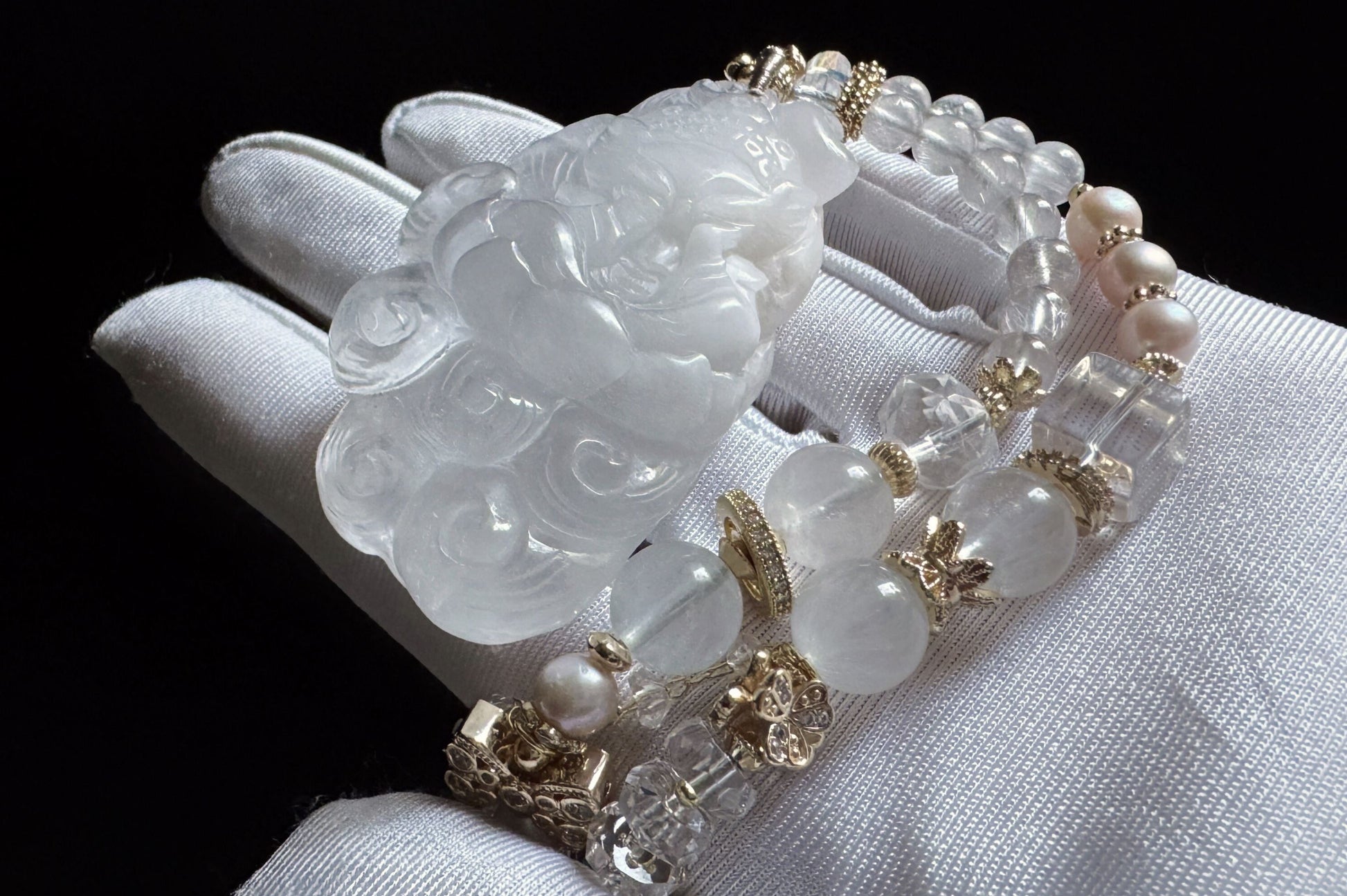 Large Natural White Rabbit Hair Quartz Hand Carved Nine Tailed Fox Pendant, High Grade White Rabbit Hair Necklace, 天然精品白兔毛手工精雕九尾狐吊坠