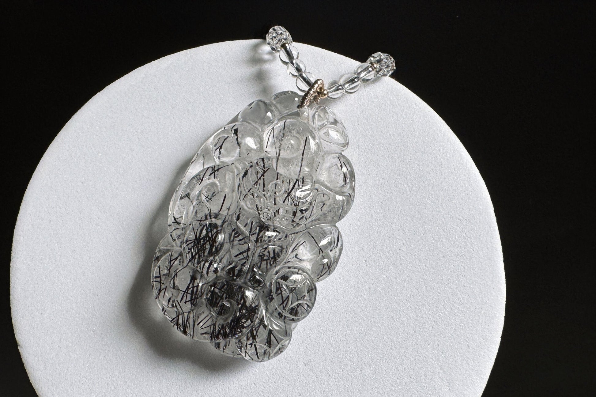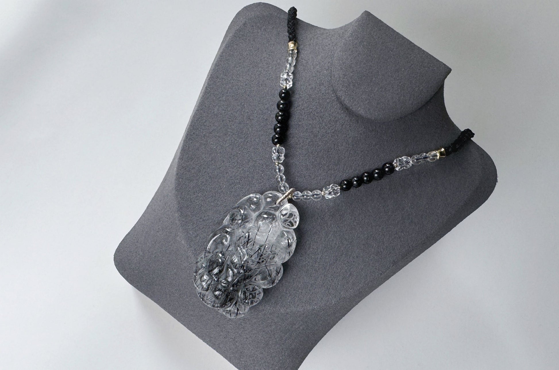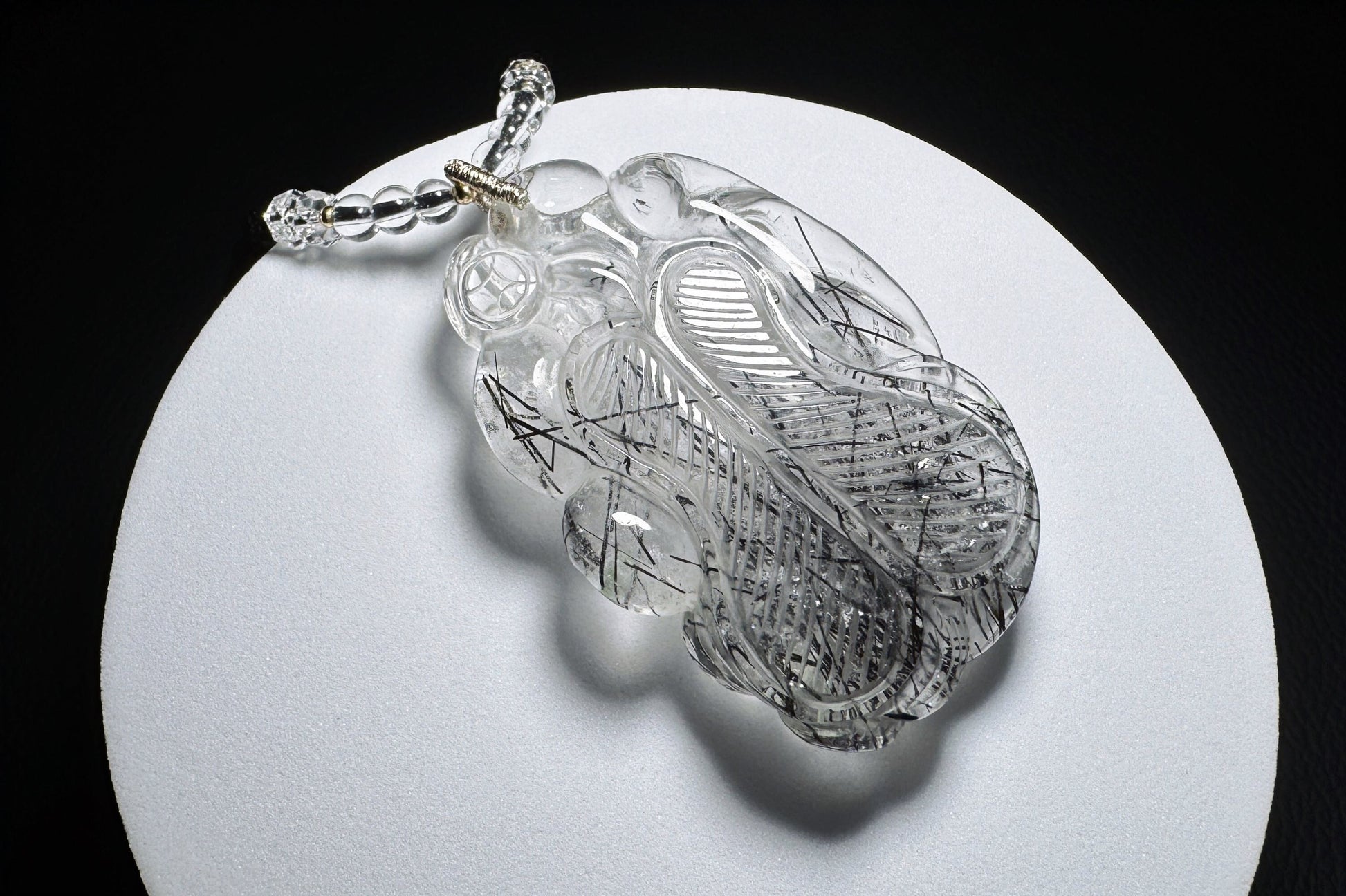 High quality natural Black Rutilated Quartz with needle like inclusion. The clear quartz part are of high transparency and not cloudy. The pendant is carved by hand with amazing details and full of spirits.