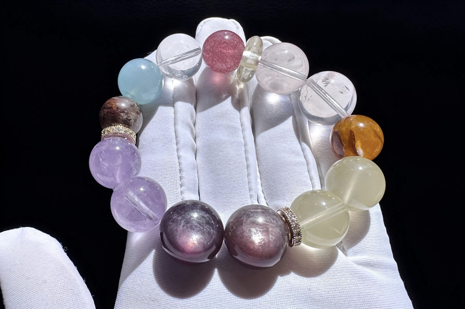 Natural Multi-gemston Bracelet, Rose Quartz Aquamarine Beaded Bracelet, 天然猫眼紫锂辉搭配海蓝宝粉晶葡萄石手串