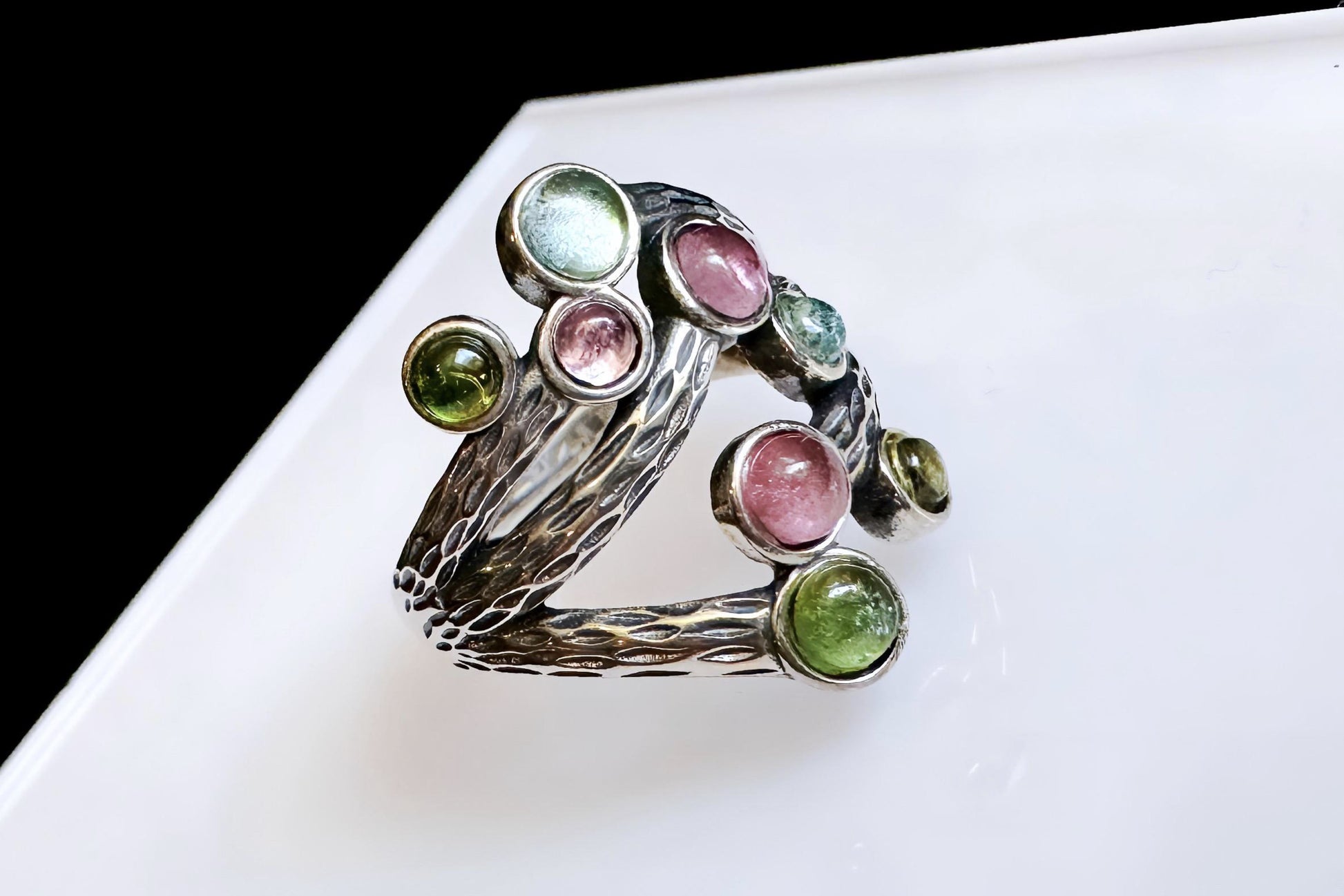 Natural tourmaline stones in mermaid colors that is not picky on light, also ensures sufficient saturation of brilliance. The colors include lake blue, pink, yellow, and green. The setting is made with S925 premium thick silver. High quality and a nice weight on your finger.