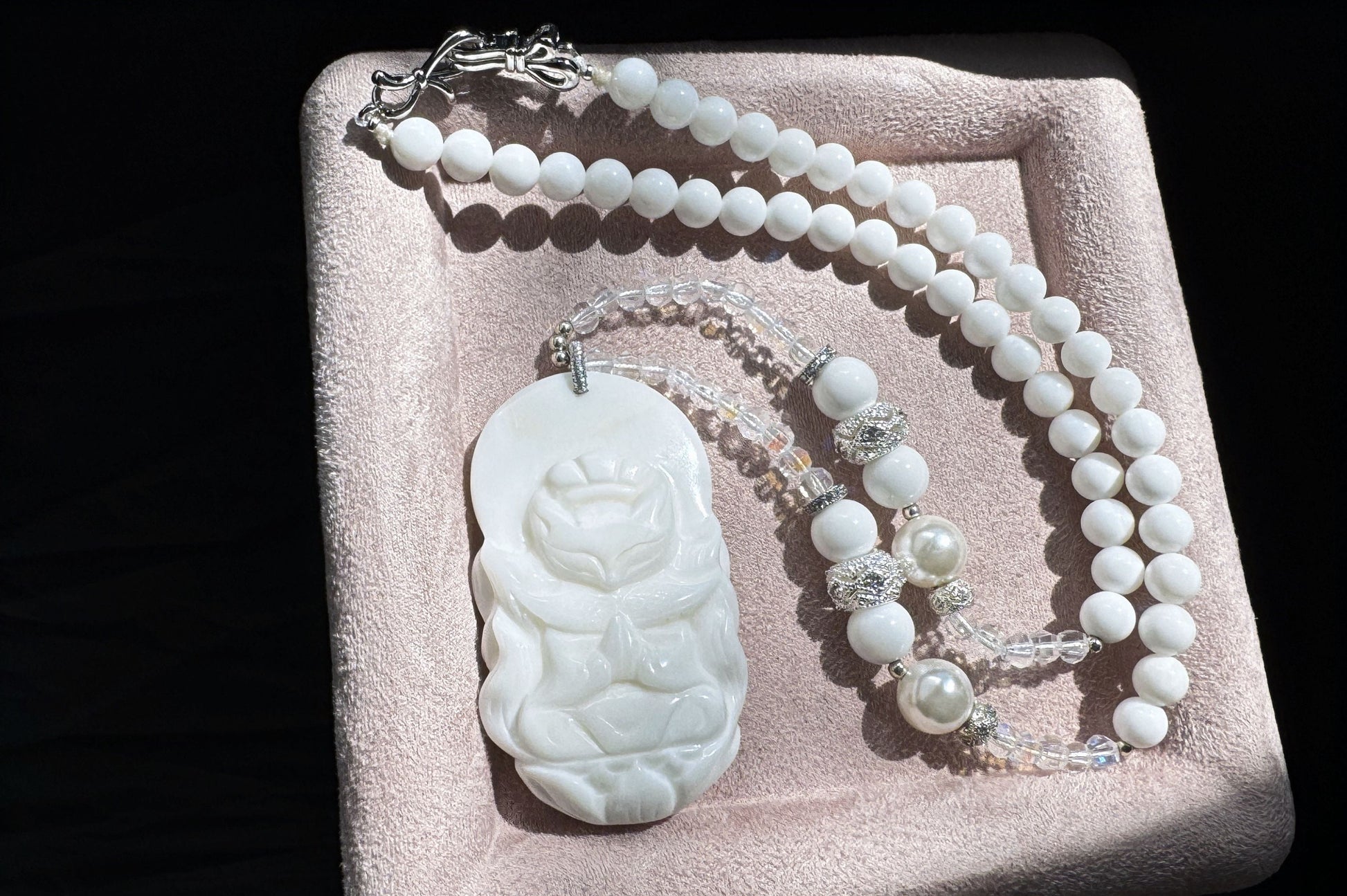 Natural Tridacnae Fox Spirit Pendant Necklace, Hand Carved Tridacnae Fluted Giant Clam Nine Tailed Fox, 天然砗磲全玉化料手工雕刻九尾狐修仙吊坠配砗磲珠链